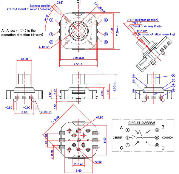 Description:Note 1. Model Type : Multiway Switch 2. Model Name : ST-1501 3. Rating : 12V DC 50mA 4. Life : 100,000cycles