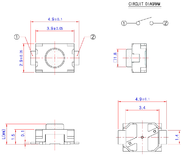Description:Note 1. Model Type : SMD Switch 2. Model Name : ST-1185S 3. Rating : 12V DC 50mA 4. Life : 100,000cycles 5. Height (L) :1.5 / 2.0 / 2.5mm