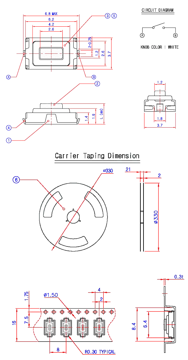 Description:Note 1. Model Type : SMD Switch 2. Model Name : ST-1107MU 3. Rating : 12V DC 50mA 4. Life : 50,000cycles 5. Height (L) :2.5 / 3.1mm