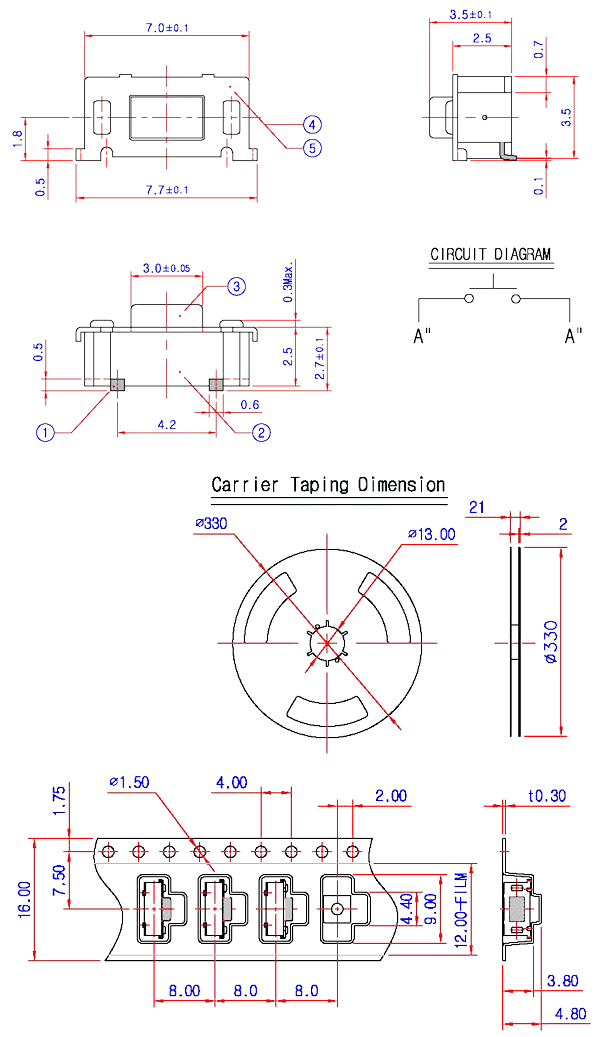 Description:Note 1. Model Type : SMD Switch 2. Model Name : ST-1112 3. Rating : 12V DC 50mA 4. Life : 50,000cycles