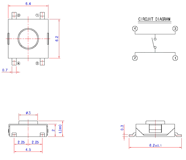 Description:Note 1. Model Type : SMD SWitch 2. Model Name : ST-1157 3. Rating : 12V DC 50mA 4. Life : 100,000cycles 5. Height (L) :2.5 / 3.1mm