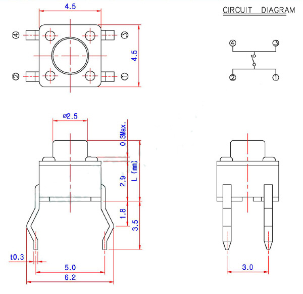 Description:Note 1. Model Type : Tact Switch 2. Model Name : ST-1109 3. Rating : 12V DC 50mA 4. Life : 50,000cycles 5. Height (L) :3.8 / 7.0mm