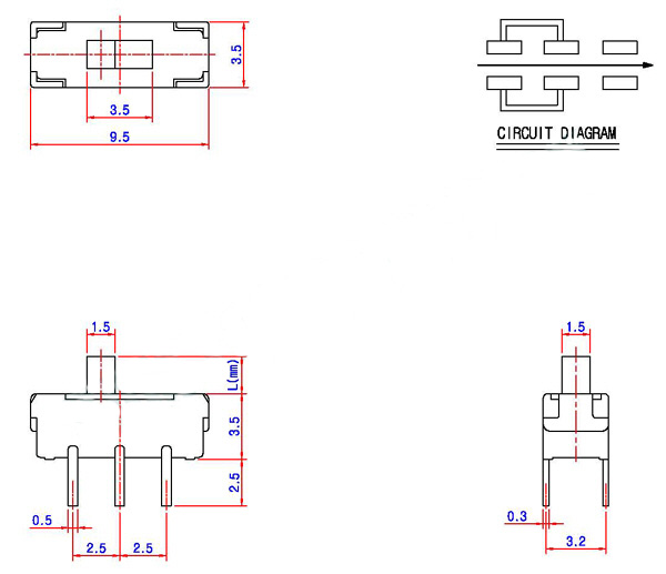 Description:Note 1. Model Type : Slide Switch 2. Model Name : SS-2235 3. Rating : 6V DC 0.3A 4. Life : 10,000cycles