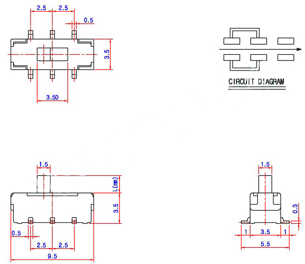 Description:Note 1. Model Type : Slide Switch 2. Model Name : SS-2235S-1 3. Rating : 6V DC 0.3A 4. Life : 10,000cycles
